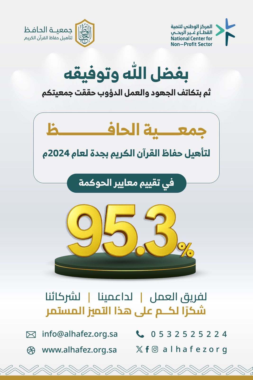 بفضل الله وتوفيقه، ثم بتكاتف الجهود والعمل الدؤوب، حققت جمعية الحافظ لتأهيل حفاظ القرآن الكريم بجدة نسبة 95.3% في تقييم معايير الحوكمة لعام 2024م، وذلك وفق نتائج التقييم الصادرة عن المركز الوطني لتنمية القطاع غير الربحي.